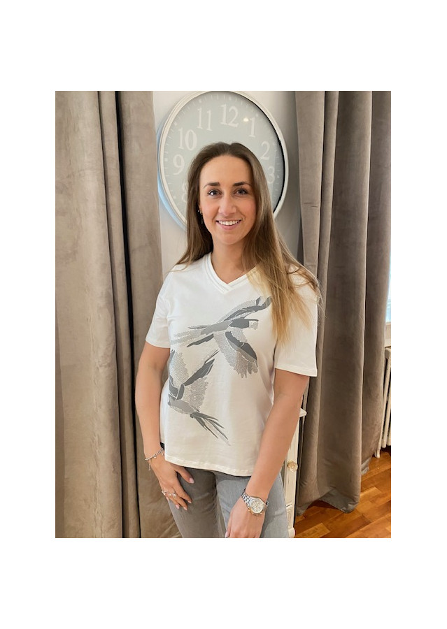 T.shirt blanc col V impression oiseaux strassés Lebek